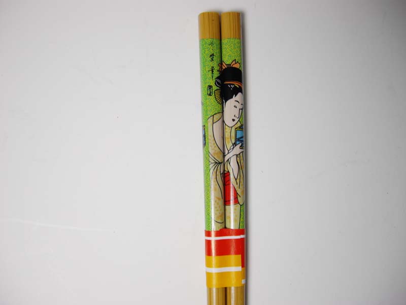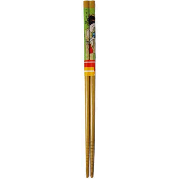 Bacchette per sushi in bambu con disegno di una geisha su base verde chiaro con lavorazione antiscivolo per la presa dei alimenti