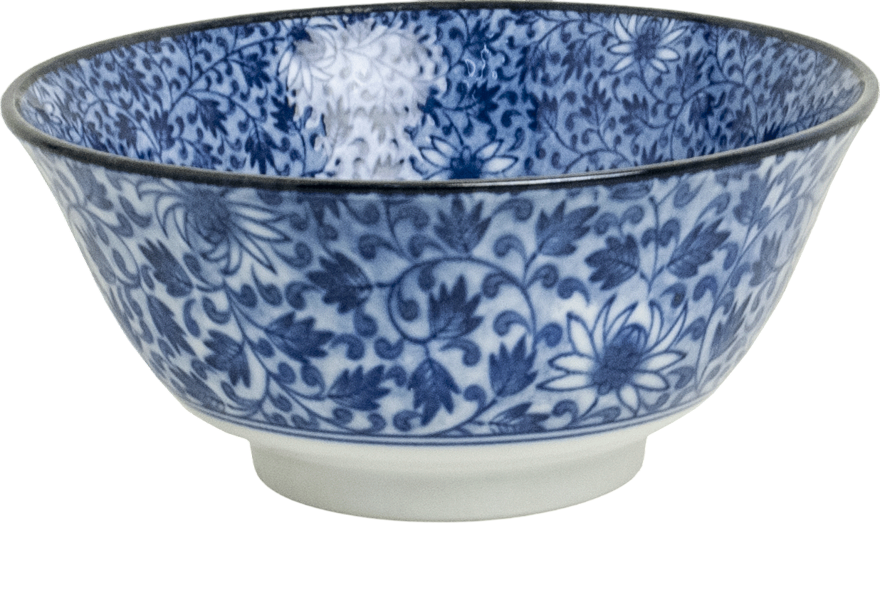 Ciotola giapponese in ceramica decorata con eleganti motivi floreali blu su fondo bianco, ideale per ramen, donburi o zuppe, con uno stile raffinato che richiama la tradizione nipponica.