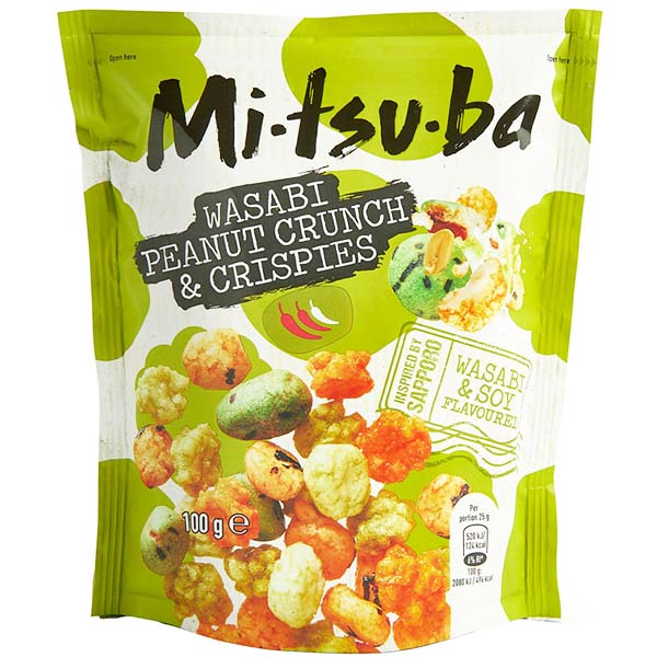 Mix di crackers di riso e arachidi ricoperte all'aroma piccante di wasabi e soia.