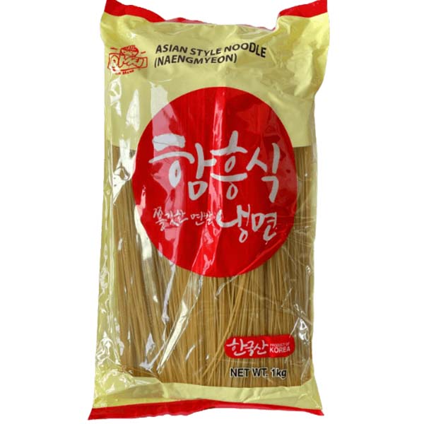 Assi Brand Asian Style Noodle, Hamheung Naengmyeon è un tipo di noodle coreano caratterizzato da una consistenza liscia e chewy, ideale per la preparazione di piatti freddi. Questi noodle sono tipici della regione di Hamheung, famosa per il suo metodo di produzione artigianale e per l'uso di ingredienti freschi.