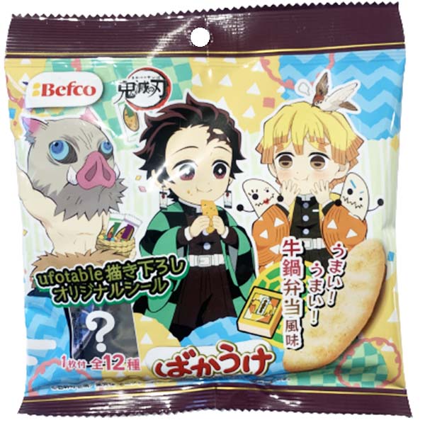 Senbei cracker di riso al gusto di sukiyaki, è un piatto della cucina giapponese nello stile nabemono ovvero "alla pentola". Due tipi di confezioni con i personaggi di "Kimetsu no Yaiba", conosciuto anche come Demon Slayer. Non è possibile scegliere il tipo di confezione. È presente 1 carta di Kimetsu no Yaiba da collezione, ci sono 12 tipi di carte da collezionare.